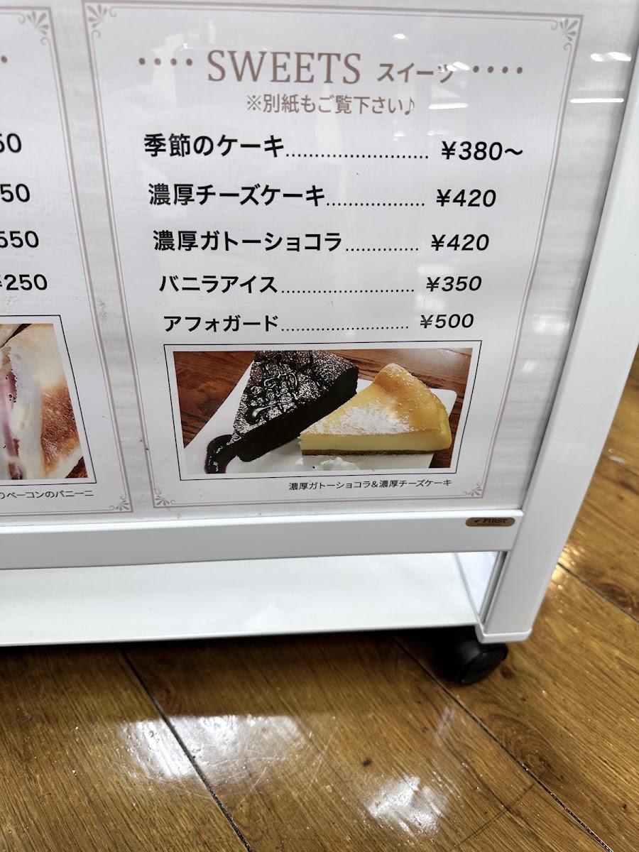 For desserts and light food, the menu features options like バニラチーズケーキ (vanilla cheesecake), ガトーショコラ (gateau chocolat), and other seasonal cheesecake varieties, which can be paired in cake sets with drinks. These items are ideal for guests looking for a light sweet accompaniment alongside their coffee.